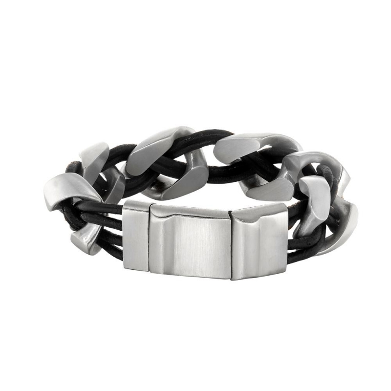 Men’s Stainless Steel and Black Leather Braided Bracelet. 9 1/4 inches length.