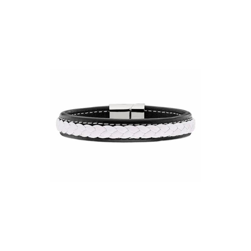 Men’s Stainless Steel Framed with Black Leather and White Leather Weave Bracelet.