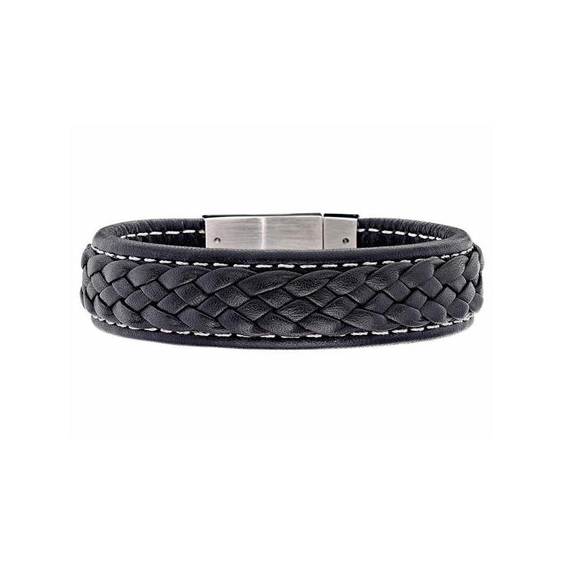 Men’s Stainless Steel Wider Black Leather Weave Bracelet. 8 inches length.