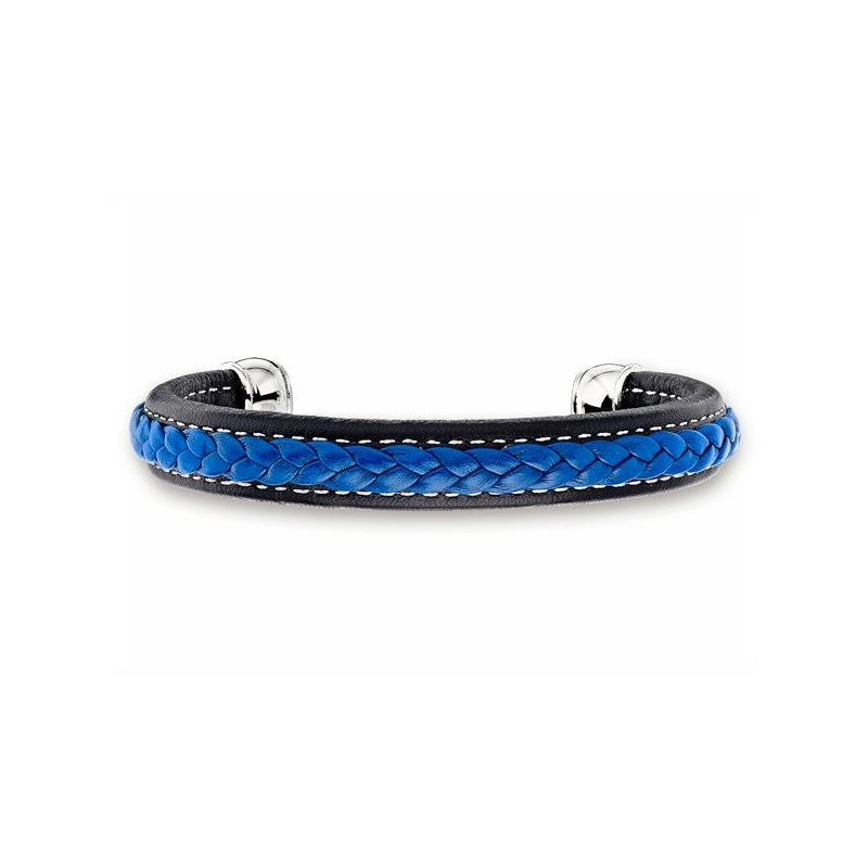 Men’s Stainless Steel Framed with Black Leather and Blue Leather Weave Bracelet. 8 inches length.