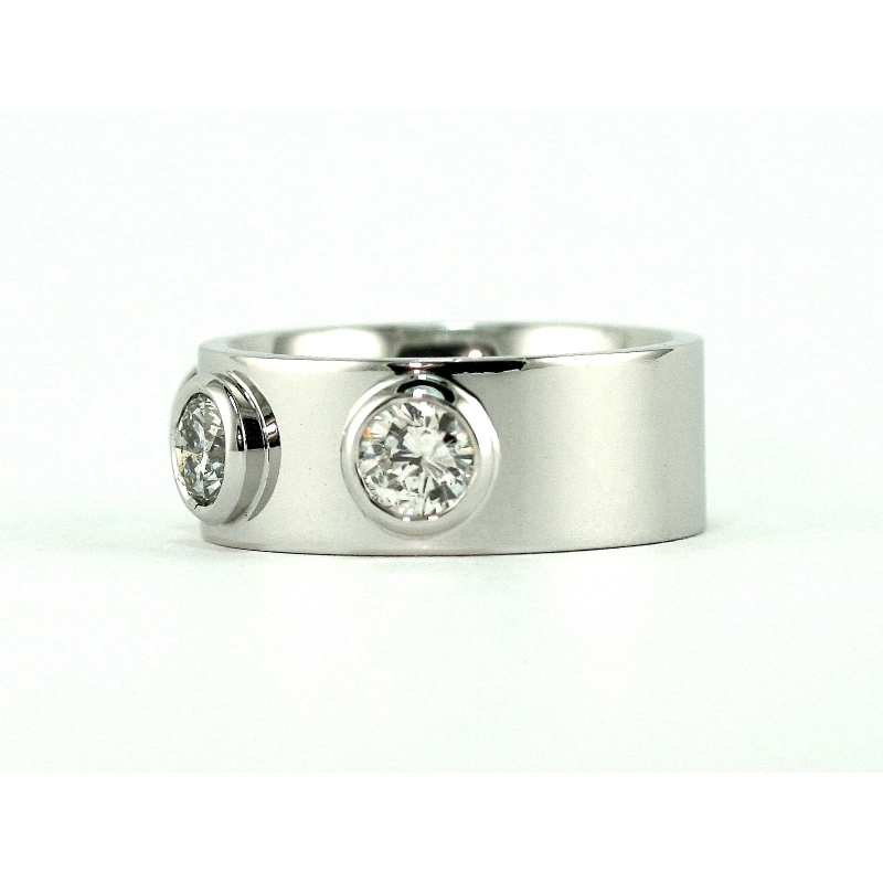 Solid white gold 8 mm width around flat comfort fit band ring. Three round brilliant cut diamonds (6 mm diameter), each bezel set finishing off this modern contemporary motif. High polished mirror, satin or hammer finish. Available with one to six stones.