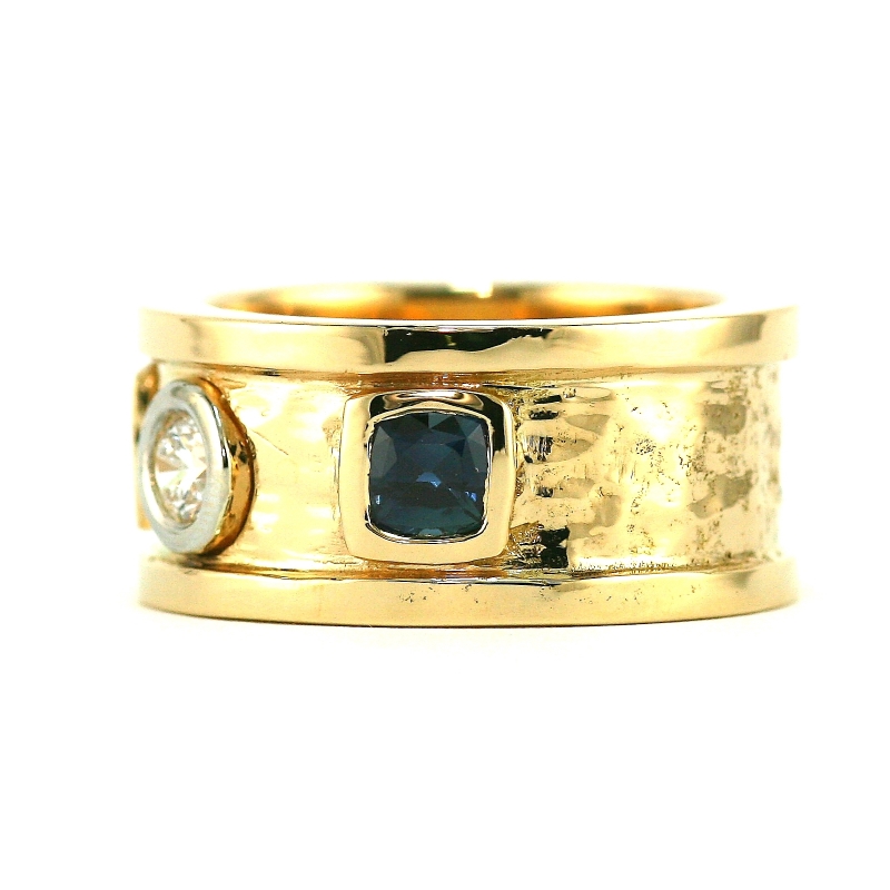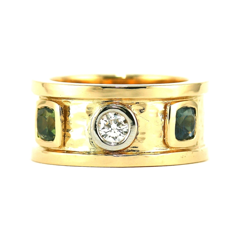 Distinctly Etruscan old world design (12 mm width) solid 18K yellow gold band ring. Center top is a round brilliant cut 8 mm diamond bezel set in thick white gold. Framing each side is a green and blue sapphire thickly bezel set in yellow gold. The center body has a soft hammer finish with polished raised frames on either side.
