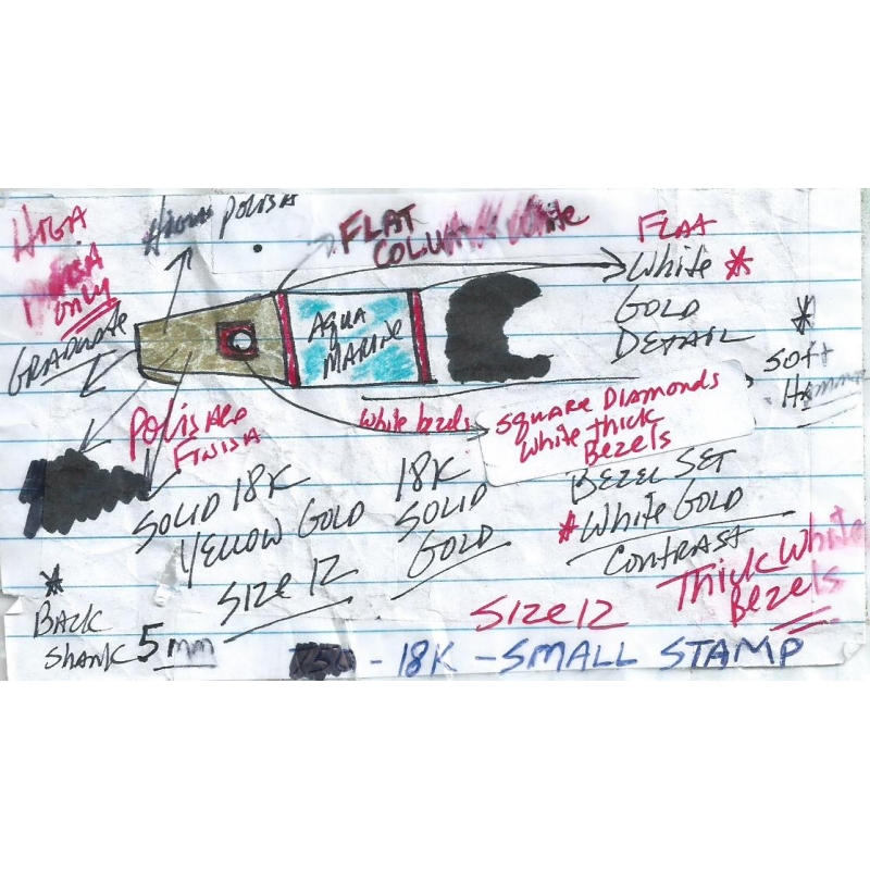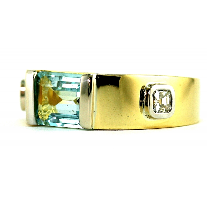 Aqua Marine (5 ct emerald cut) in a tension setting. The frame setting is in white gold and the shank is in yellow gold. Each side of the graduated shank are 4 mm Asher cut diamonds bezel set in white gold. High polished mirror finish design.