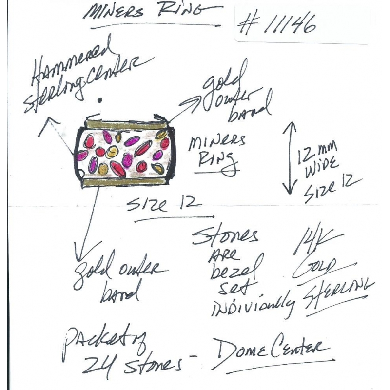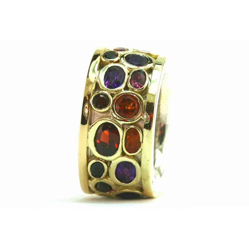 Lavish design in a wide two tone yellow and white gold (15 mm) band ring with 27 round and oval gemstones. Outer frames and each gemstone individually bezel set in yellow gold.