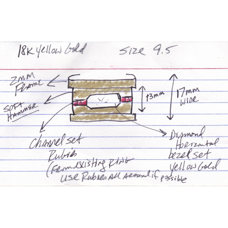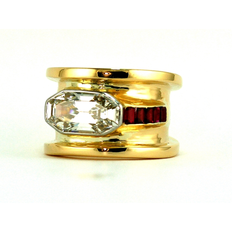 Bold design in solid yellow gold, wide band (18 mm) with a soft texture center. Top has an emerald cut Diamond (5.38 ct) bezel set in contrast white gold. Framed on either side are square cut Rubies channel set into the shank. High polished mirror finish.