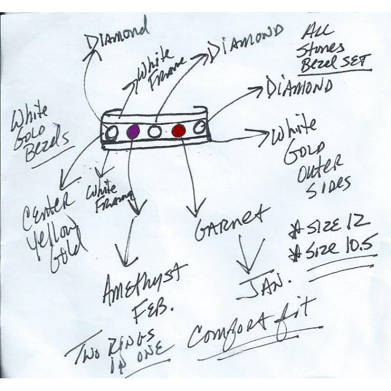 Round brilliant cut diamonds, garnet and amethyst. Two tone yellow and white comfort fit gold band ring. Each stone is individually bezel set. High polished mirror finish.