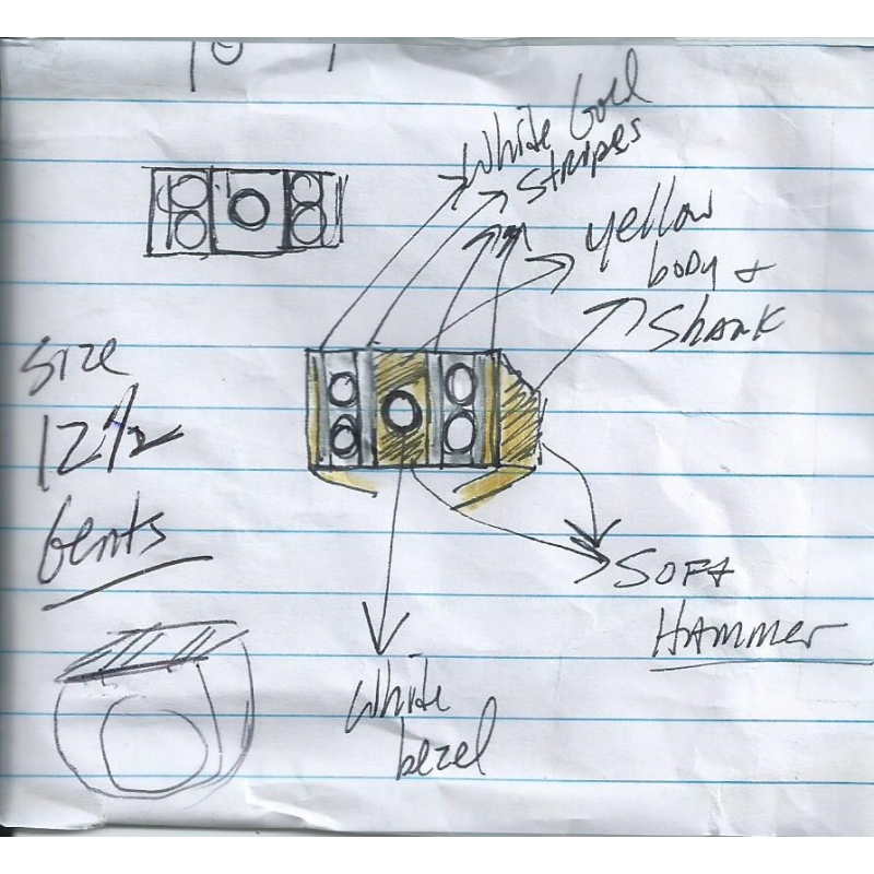 Signet design, rectangle top with bezel set and channel set diamonds. Two tone yellow and white gold setting. Soft hammer texture and high polished mirror finish.