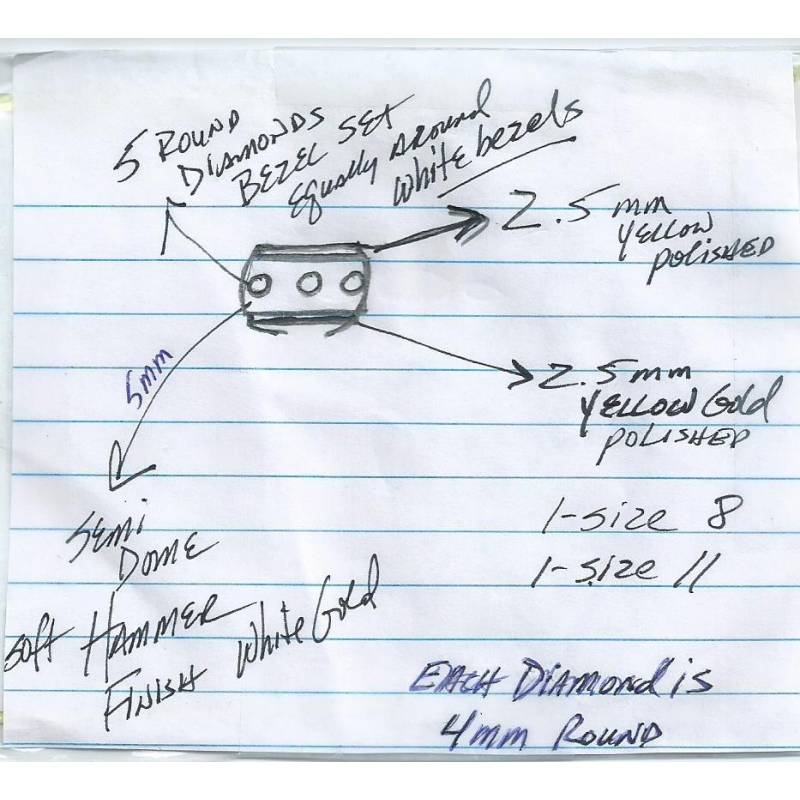 Two tone yellow and white gold band ring. Center slightly raised from sides. Five (5) round diamonds bezel set. High polished mirror finish.