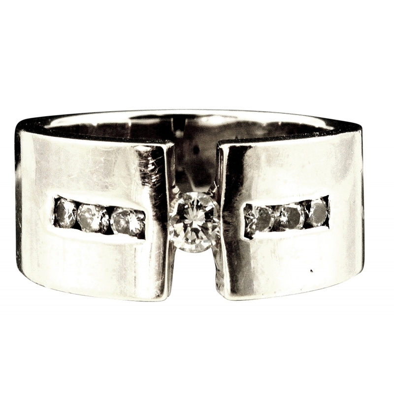 White gold tension and channel set round brilliant cut diamonds. Band ring (8mm width) mounting with a high polished mirror finish.