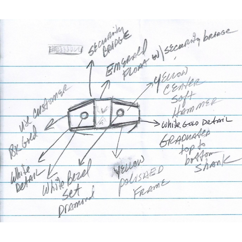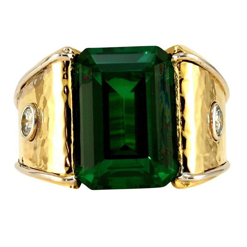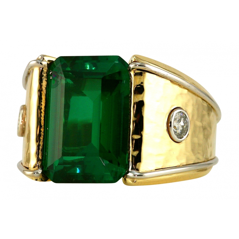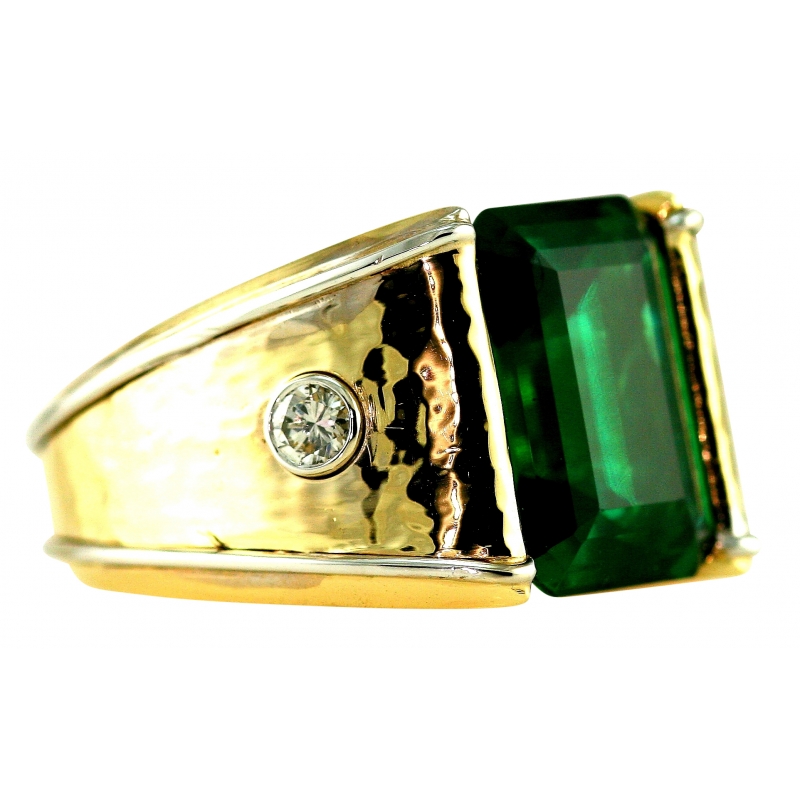 Emerald and diamond two tone yellow and white gold ring. Signet design with an emerald tension set stone and round brilliant cut diamonds bezel set on the sides. White gold detail he yellow gold body. Soft hammer texture, polished mirror finish.