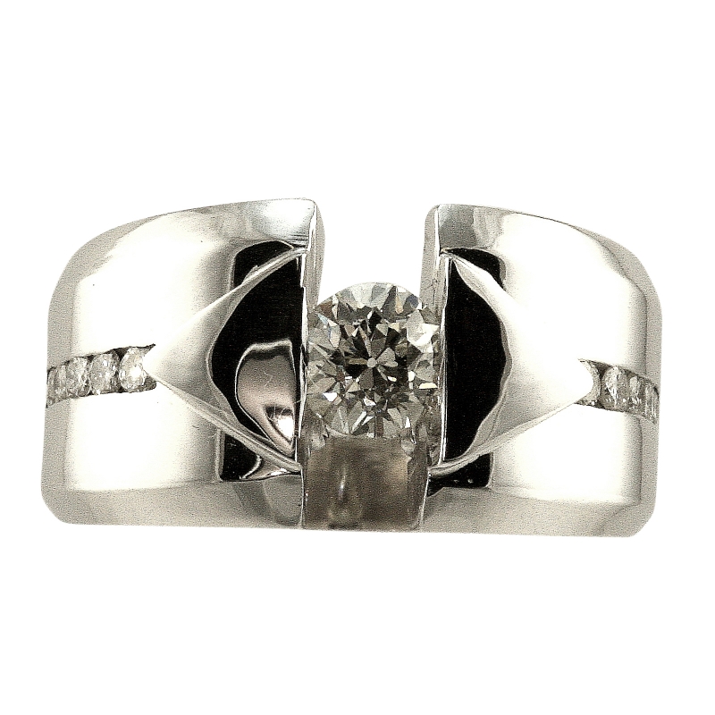 Diamonds in a modern style design. Round brilliant cut diamonds tension set (with an invisible security bridge) and channel set in this ring motif. Wide top graduates to slimmer bottom shank. Flat top with bevel edges. High polished mirror finish.