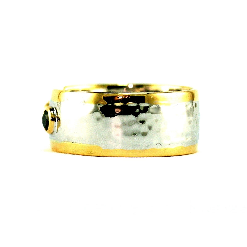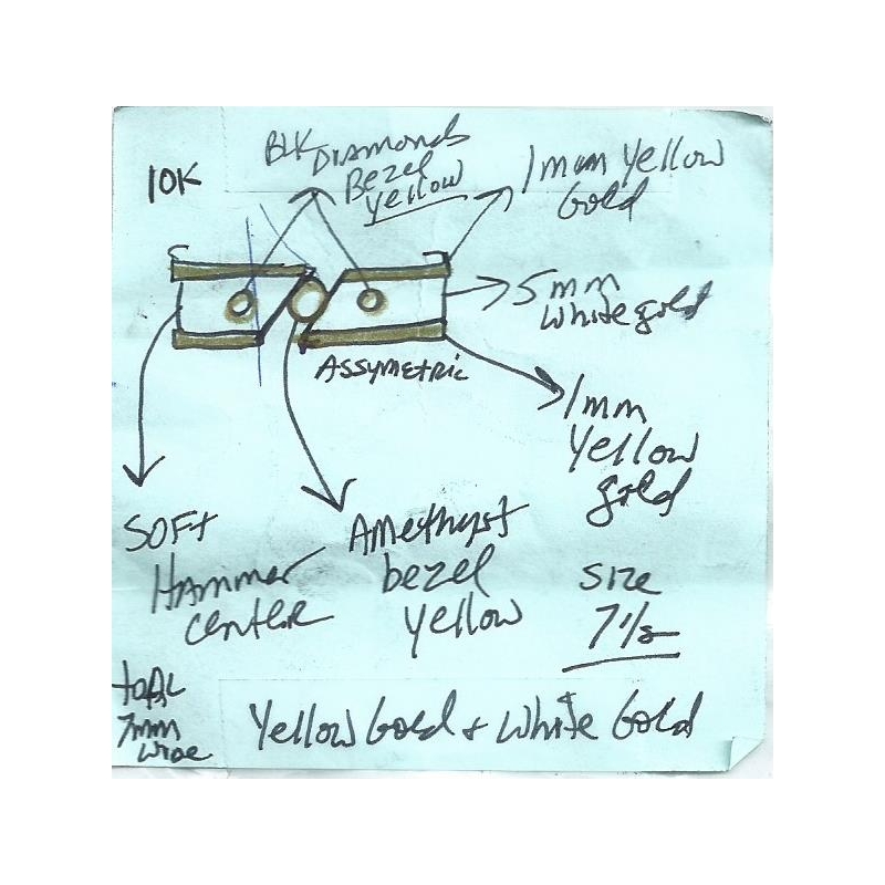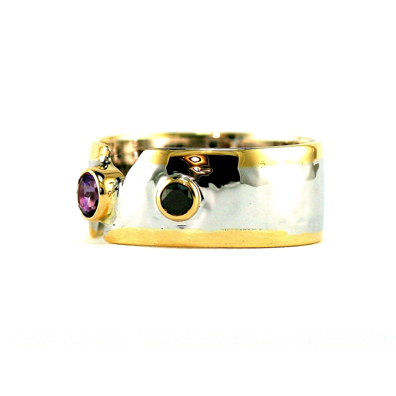 Two tone design with a white gold center and framed with yellow gold edges. Round cut amethyst, bezel set two round cut black diamonds all bezel set in yellow gold. Soft hammer texture, high polished mirror finish.