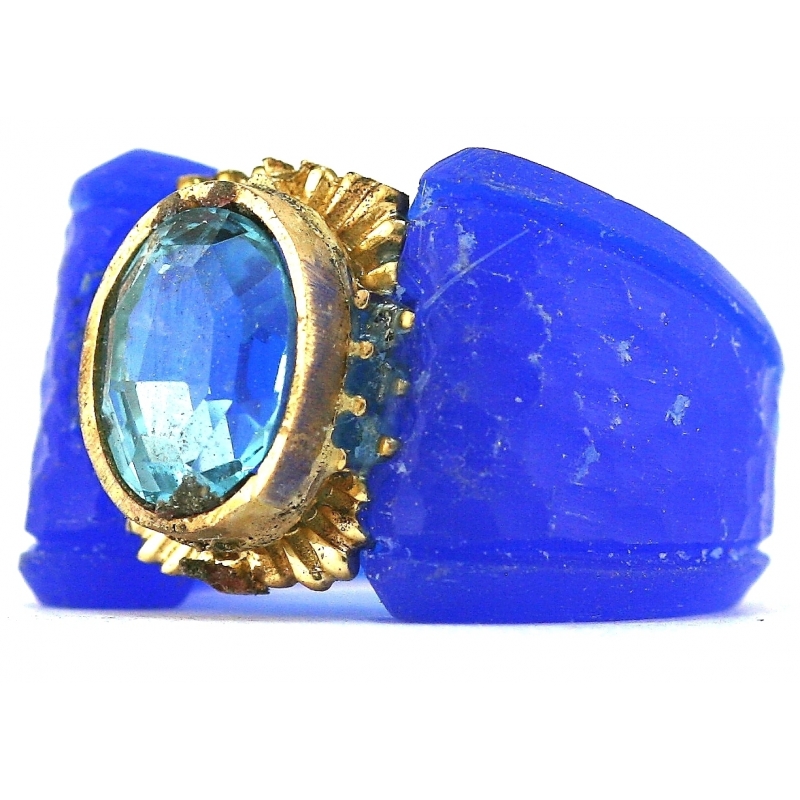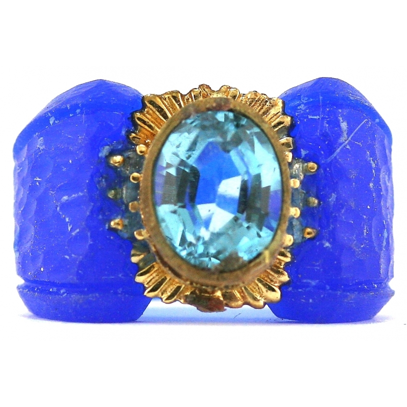 Blue topaz framed in a crest design on a soft hammer texture mounting. White gold linear motif details the body of the shank. High polished mirror finish.