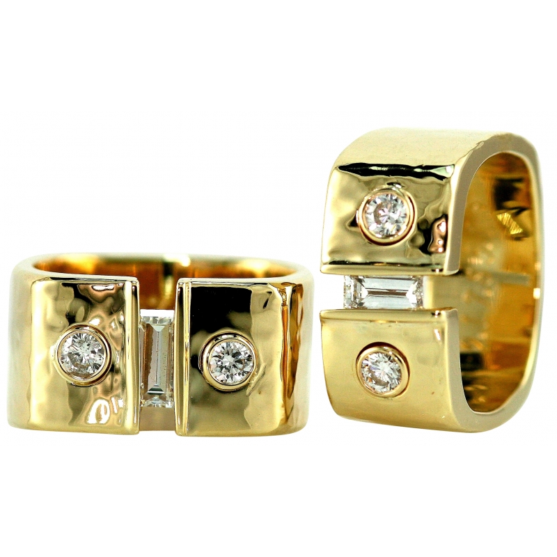 Solid yellow gold and diamonds in an outer square and inner circle design. Soft hammer texture on a 14 mm wide band totally around the shank. The top of this ring motif has a diamond baguette tension set (with an invisible security bridge) and two (2) round brilliant cut diamonds bezel set on either side. Comfort fit with a high polish mirror finish.