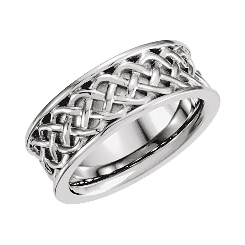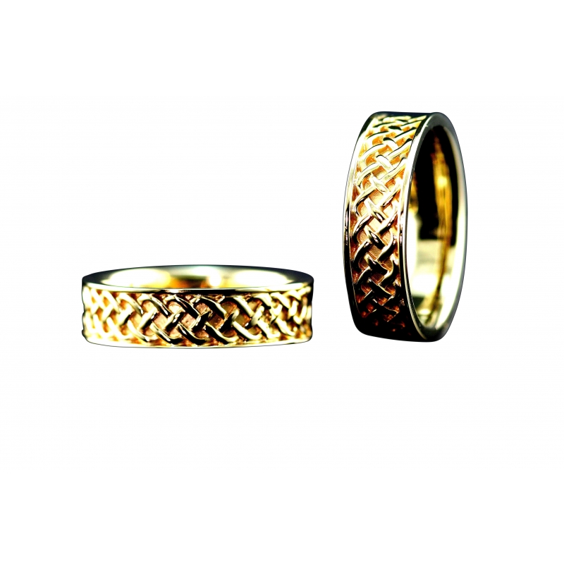 Celtic weave design goes all around the band. Solid gold 7.5 mm wide band design is framed in a high polished edge.