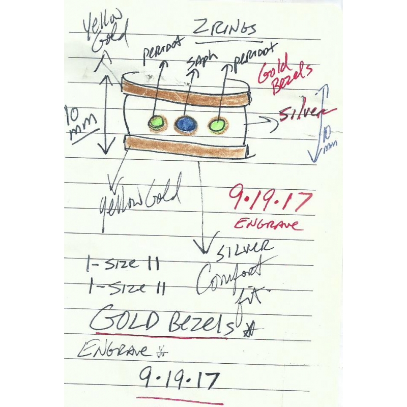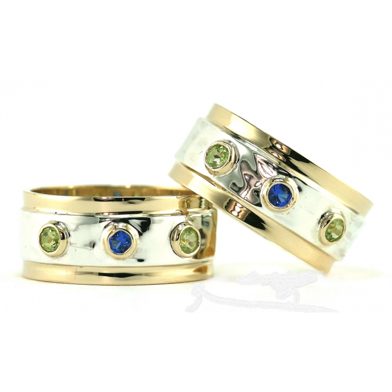 Two tone yellow gold and sterling silver wide (10 mm width) rings. Same width total around the shank. Center silver has a soft hammer texture finish (6 mm diameter) and step down yellow gold framed ends (2 mm each side). Top center has two 3mm diameter round cut Peridot's (August birthstone) on either side of a 3mm diameter round cut blue Sapphire (September birthstone). All six gemstones bezel set in solid 14K yellow gold for contrast. High polished mirror finish. Available in the reverse two tone (gold) configuration with yellow gold center and white gold ends as well as an all solid color.