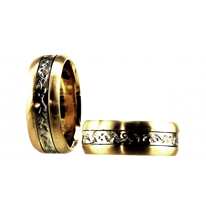 Two tone yellow and white gold 7 mm wide rings. Center has an engraved pattern totally around. Satin brush finish.