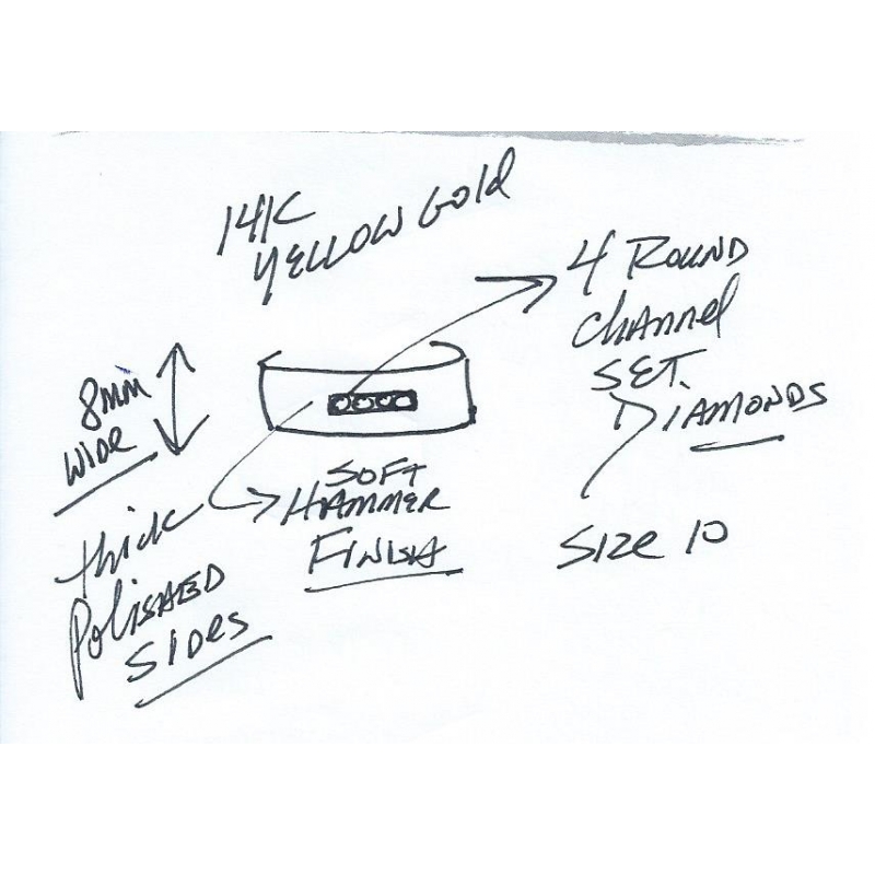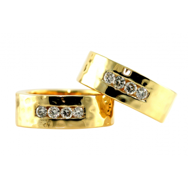 Round brilliant cut diamonds channel set in the center of an 8 mm wide gold band ring. Can be created with more or less center channel set stones. Soft hammer texture, polished mirror finish.