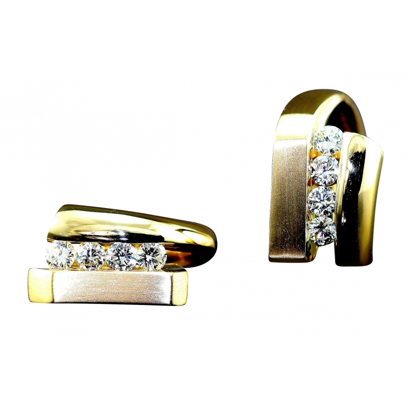 Asymmetrical sides with channel set round brilliant cut diamonds set in gold. Geometric and rounded shapes with satin and high polish mirror finish.