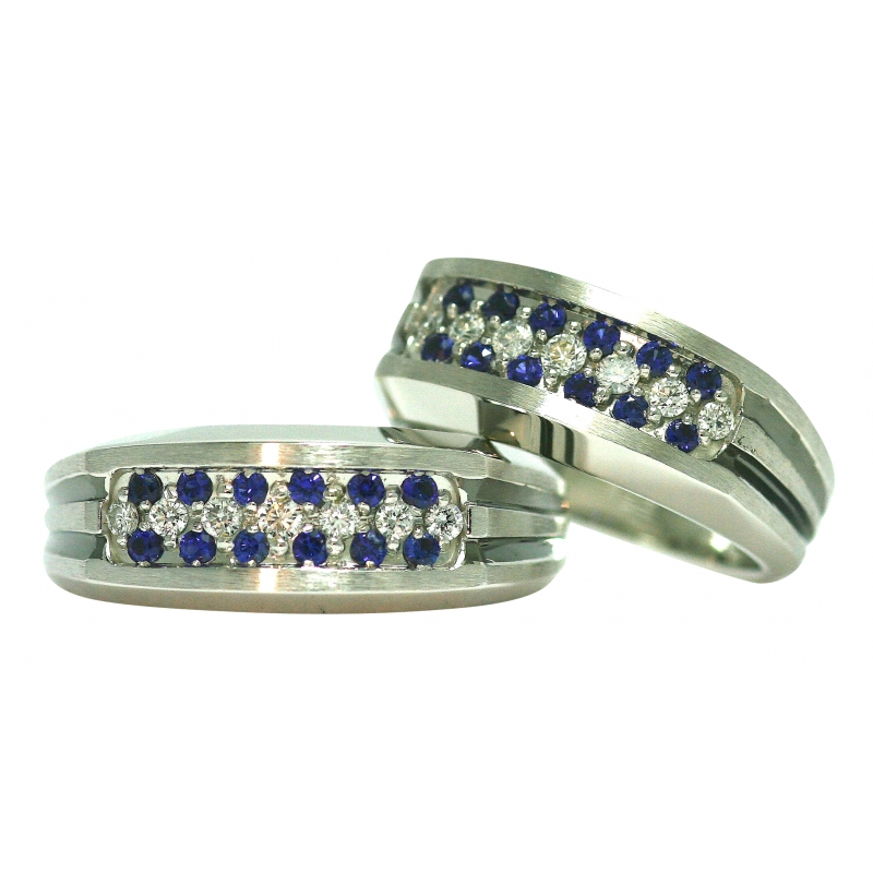 Three rows of 12 cobalt blue natural sapphires and 7 white diamonds pave set in the top center. Graduated shank with a high polished mirror finish.
