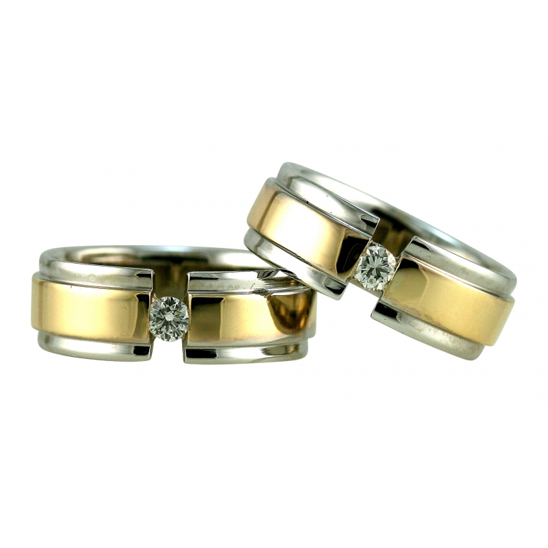 White and yellow gold dimensional band ring (7.5 mm width). Round brilliant cut diamond tension set (with an invisible security bridge under the setting) in a contemporary motif. High polished mirror finish.