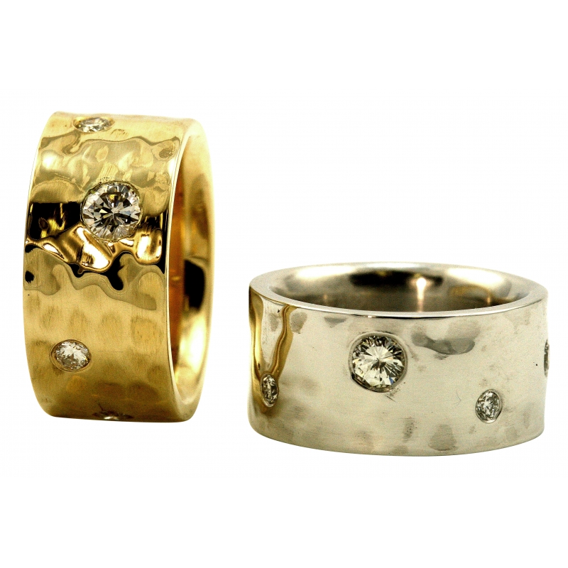 Flat modern band rings (12 mm width) with a soft hammer texture. Combination of several size round brilliant cut diamonds burnish set orbiting around the total ring. High polish mirror finish.