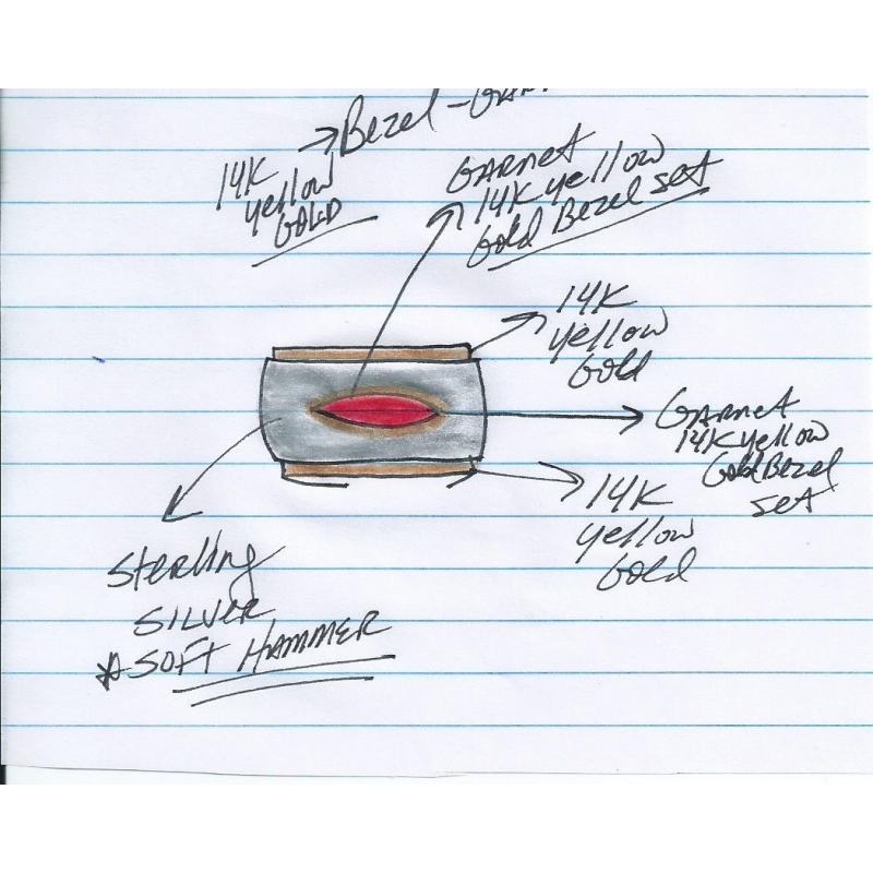 Two tone sterling silver and yellow gold wide (12 mm width) rings. Same width total around the shank. Center sterling silver has a soft hammer texture finish and the framed yellow gold edges without. Top center has a marquis cut garnet gemstone bezel set in contrasting yellow gold. High polished mirror finish. Available in the reverse two tone all gold configuration, yellow gold center with a white gold framed edge.