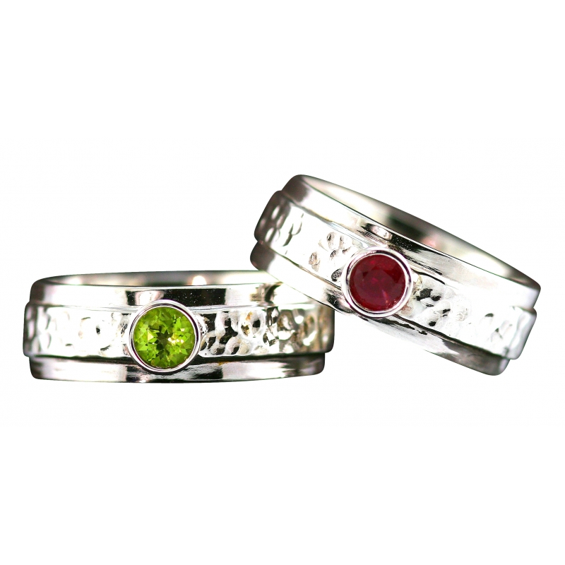 Sterling silver band rings (7.5 mm width) with a 3 mm round cut gemstone that is bezel set. Soft hammer texture center with a polished mirror finish edging.