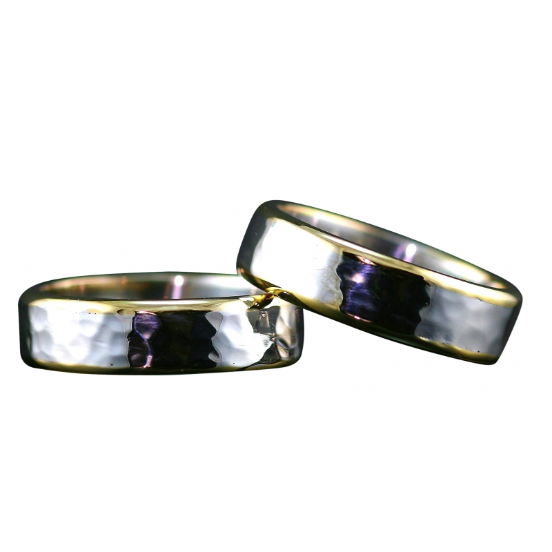 Two tone sterling silver and yellow gold band rings (7.5 mm width). Center sterling silver has a soft hammer texture finish. The yellow gold framing in a high polished mirror finish.