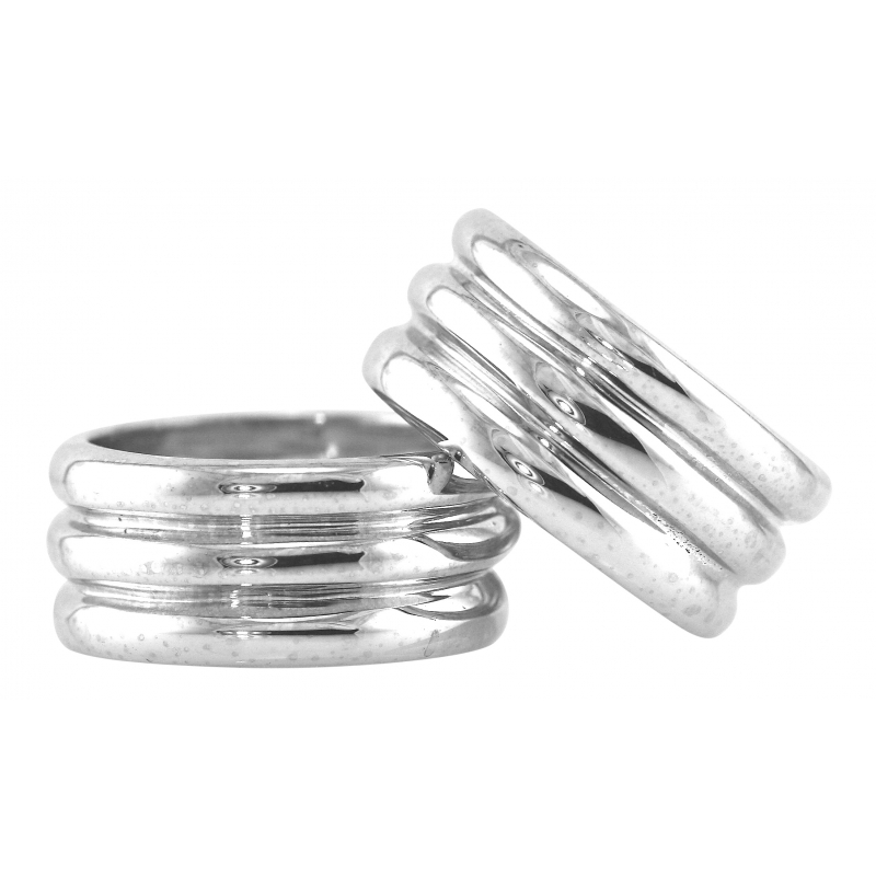 Triple rounded modern cigar band rings (10 mm width). Sterling silver domed rings in a high polished mirror finish.