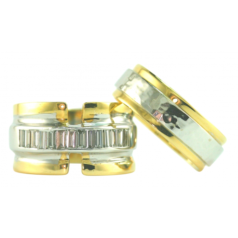 Left ring - White and yellow gold dimensional band ring (12.mm width). Baguette cut diamonds channel set in on the top part of this ring. Split center in a modern design. High polished mirror finish.