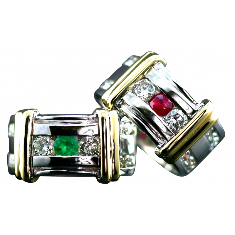 Two tone white and yellow gold diamonds with individual birthstone accents. Wide band (12 mm width) with belted yellow gold sections separating the diamond channels. Top channel has three larger stones with two rows of channel set diamonds on each side of the shank.