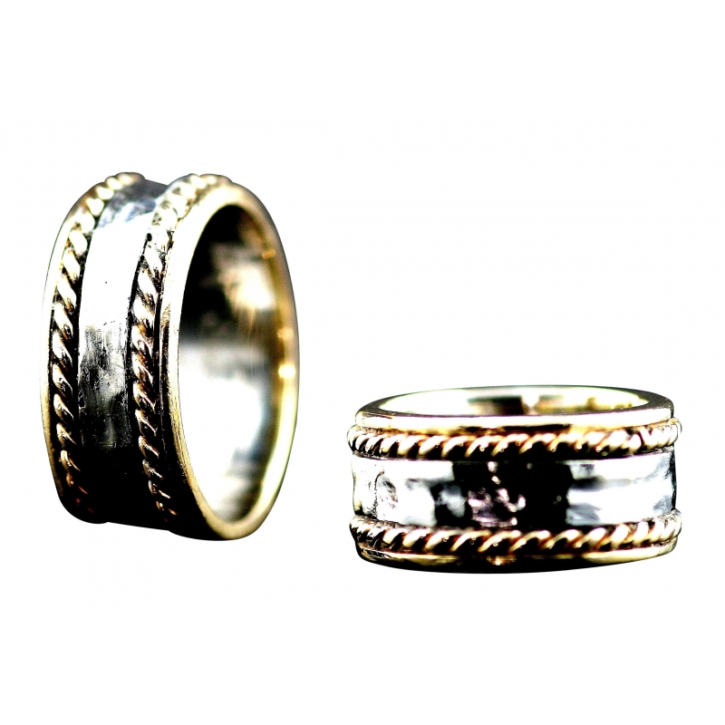Solid two tone white and yellow gold band rings (8 mm width). Soft hammer texture center body in white gold with yellow gold rope detail framing. Available in reverse yellow gold body with white gold rope detail and in 6mm width.