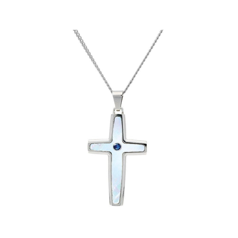 Azure Stainless Steel with Blue Sapphire and Mother of pearl inlay Mother of Pearl Cross Pendant.