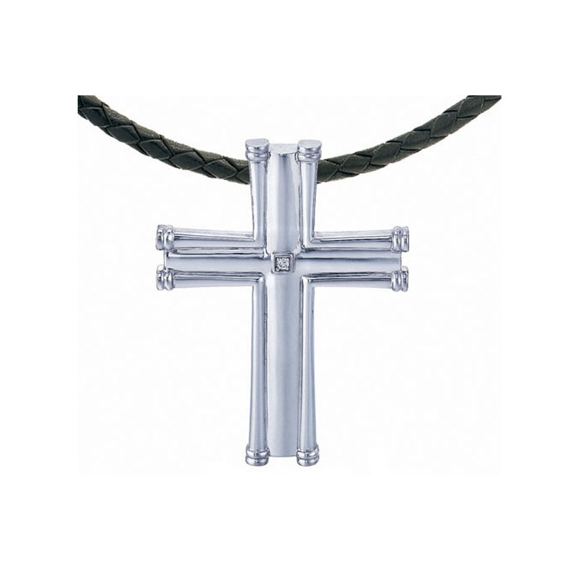 Solid Sterling Silver Cross and Round Brilliant Cut Diamond Bamboo Design Pendant.