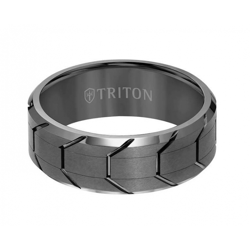 Tungsten Carbide Comfort Fit Men's Band with Gunmetal Tread Design.