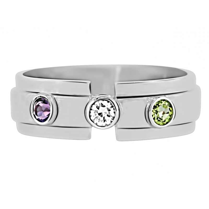 Each side with a high polished mirror finish. Three round cut gemstones. 7.5mm width.