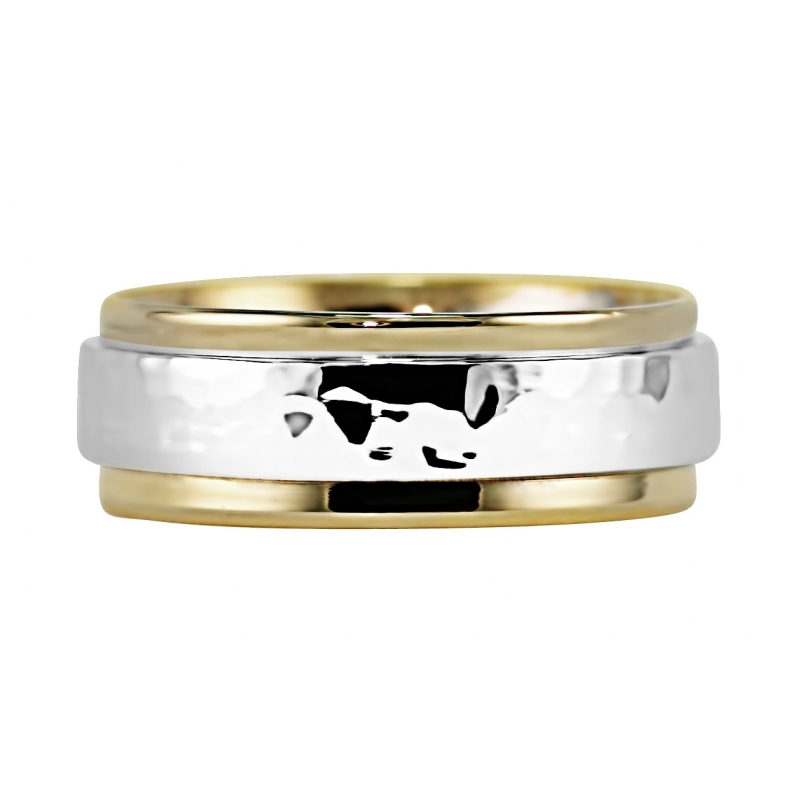 Two tone yellow/white/yellow double band ring. Comfort fit interior. This is a perfect ring by itself or for the Zodiac birthstone collection. High polished mirror finish, 7.5 mm total width the outer bands are 2 mm and the center is 3.5 mm wide.